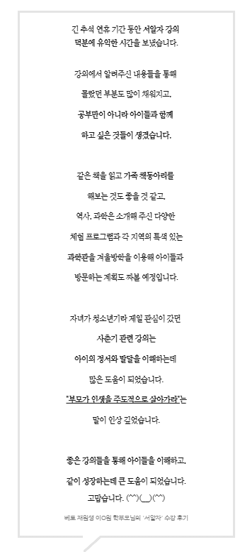베토 재원생 이O원 학부모님의 '서알자' 수강 후기