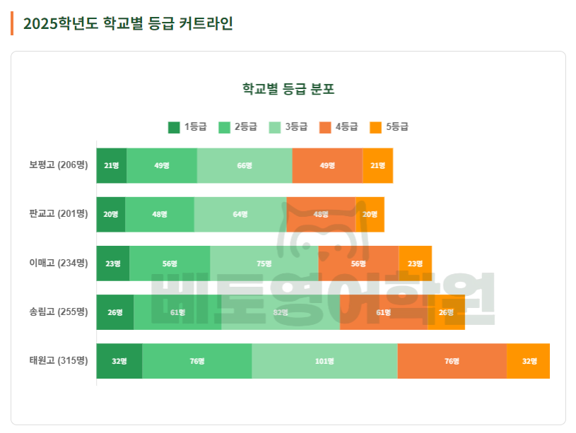 예를 들어 태원고는 1등급이 32명인 반면, 판교고는 20명입니다.