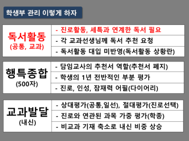 독서에 있어서 내용적인 부분은 학생부 각 항목에 후속, 연계 활동으로성의 독서를 자연스럽게 녹여낼 수 있도록 해야 합니다.