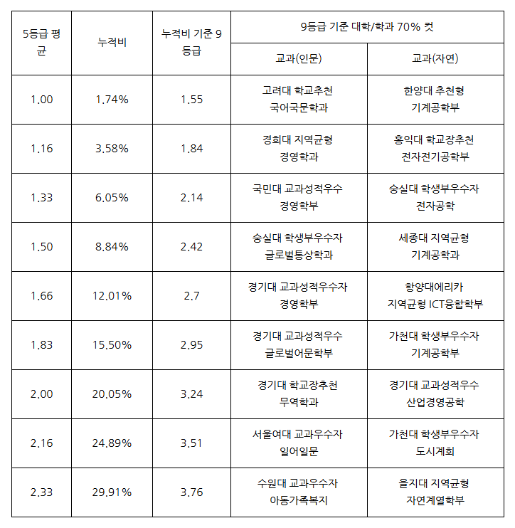 그중에서도 현재 고1부터 적용되는 내신 5등급 체제 기준에서 어느 정도 성적을 받아야 목표하는 대학에 진학할 수 있을지에 대한 관심이 큽니다. 예비고1도 마찬가지입니다.