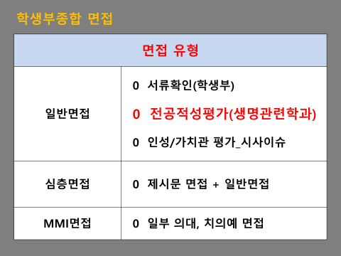 일반면접은(서류기반면접)은 기본적으로 서류확인(학생부)평가, 전공적성평가, 인성/가치관 평가가 진행됩니다.