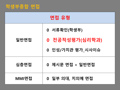 일반면접은(서류기반면접)은 기본적으로 서류확인(학생부)평가, 전공적성평가, 인성/가치관 평가(시사이슈)가 진행됩니다.