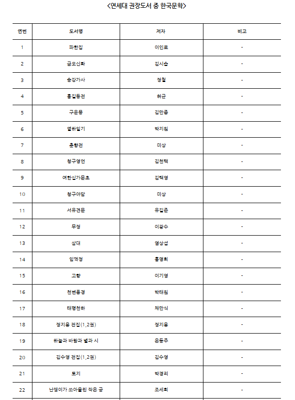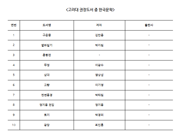 고려대는 서울대와 연세대처럼 항목별 분류를 따로 하지 않고 도서명과 저자만 공지하였습니다. 하지만 공지된 책을 보면 서울대처럼 한국문학, 외국문학, 동양사상, 서양사상, 과학기술 등으로 구성되어 있음을 알 수 있습니다.