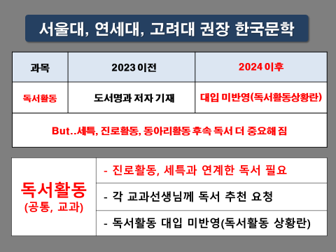 특히 서울대는 자기소개서가 있을 때에도 자기소개서 자율문항에 독서 3권을 넣었을 정도로 독서를 강조했었습니다.