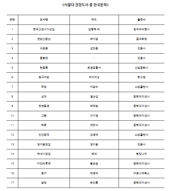 오늘은 서울대, 연세대, 고려대 권장도서 중에서 ’한국문학‘만을 발췌하여 소개해 보겠습니다. 권장도서 중 한국문학으로는 서울대는 권장도서 100권 중 17권, 연세대는 권장도서 200권 중 23권, 고려대는 권장도서 60권 중 10권입니다.