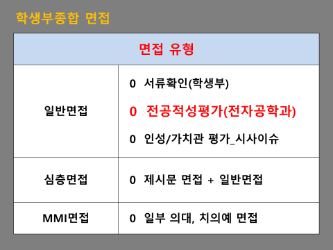 일반면접은(서류기반면접)은 기본적으로 서류확인(학생부)평가, 전공적성평가, 인성/가치관 평가(시사이슈)가 진행됩니다.