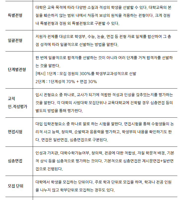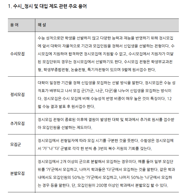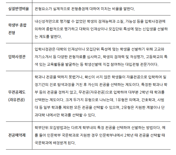기본적인 대학 입시 관련 용어에 익숙해진다면, 향후 고등학교 입학해서도 쉽게 대학 입시에 접근할 수 있을 것 같습니다.