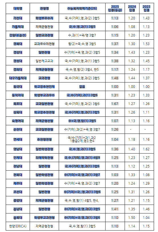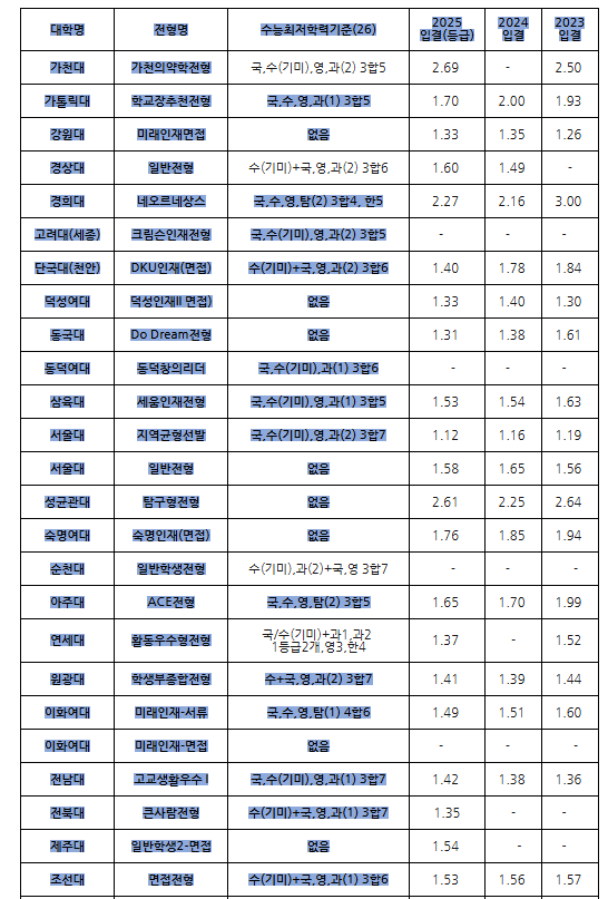 또한 수능최저학력기준에 따라 학생들마다 유리한 대학도 다르므로 대학별 수능최저학력기준을 참고하면 좋겠습니다.